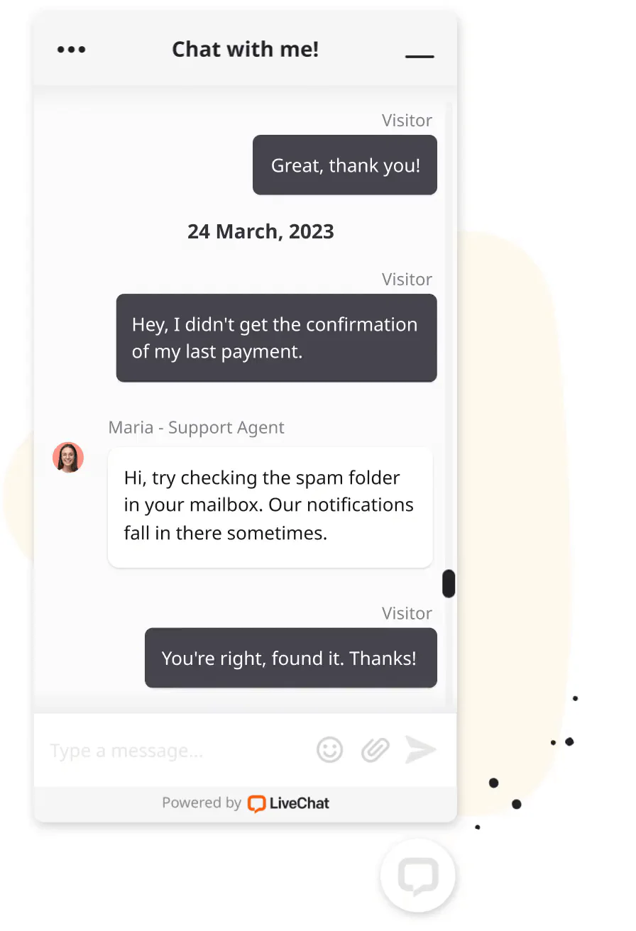 No more disappointments. Customers can start a chat and leave your website, without putting off their other plans just because they’re waiting for your reply. And once they get it, they’ll get an email they can reply to directly or via the chat widget.