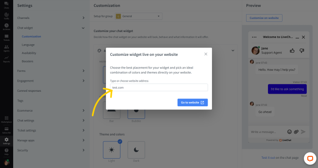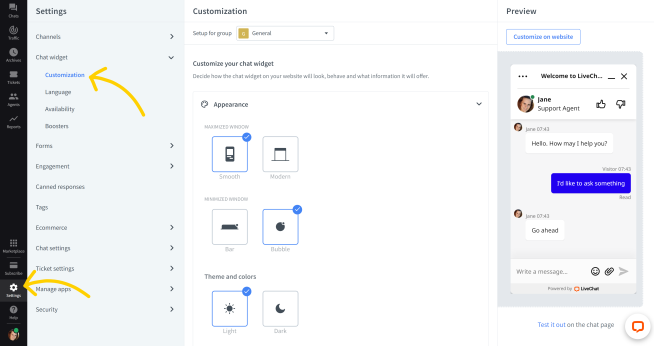 To start customizing your chat, go to the Settings → Chat window → Customization.