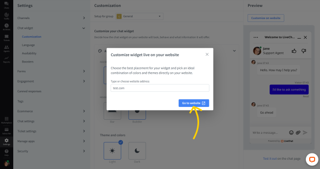 Edit the chat widget looks using settings available on the Live Editor. Preview your modifications on the widget visible on the website.