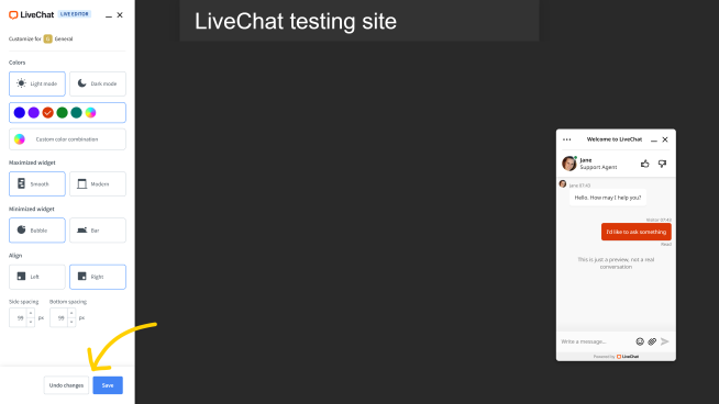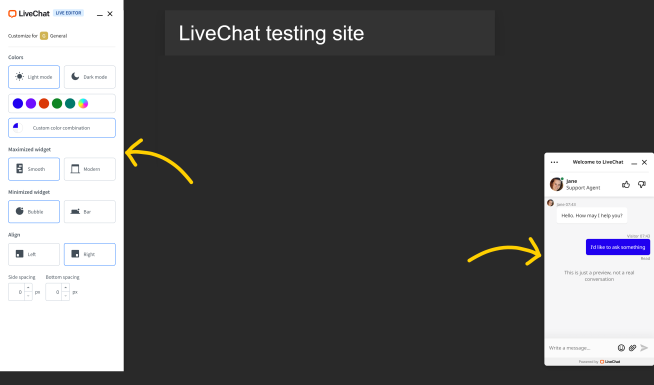 The live editor allows you to seamlessly match chat window looks and position with your website. You can use it to safely test your design on a live website without the need to save it and make it visible to the public.