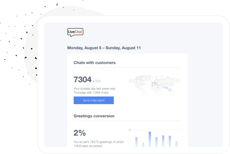 Sign up freeYou’ll be up to date with your customer service results. We’ll send you Weekly Summary of everything that’s happening in your LiveChat®. This one email shows all of your team’s performance updates, number of chats, conversion rates, and more!