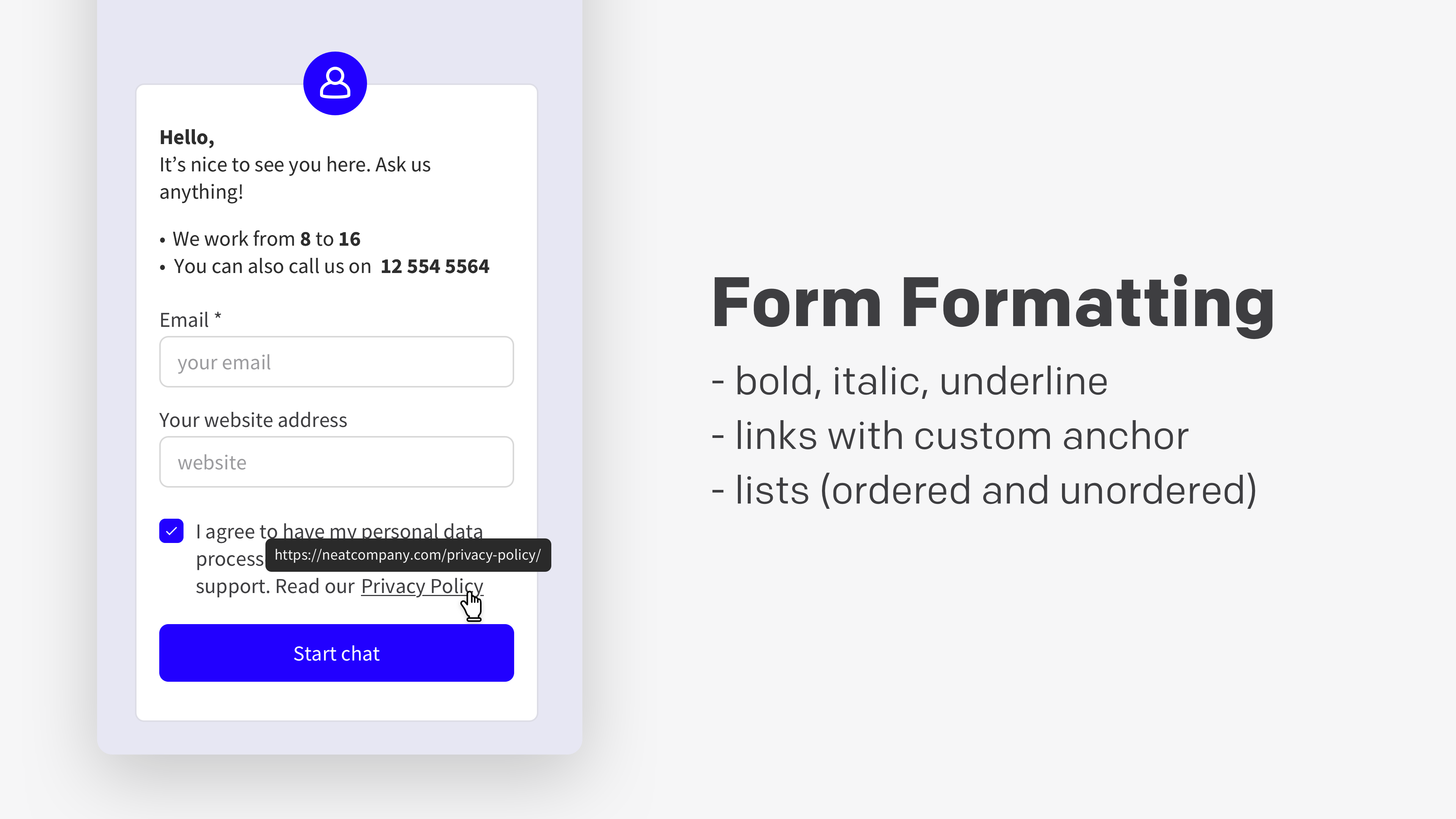 Chat forms offer text formatting. Click on the text area in a chosen field label to see the available formatting options.